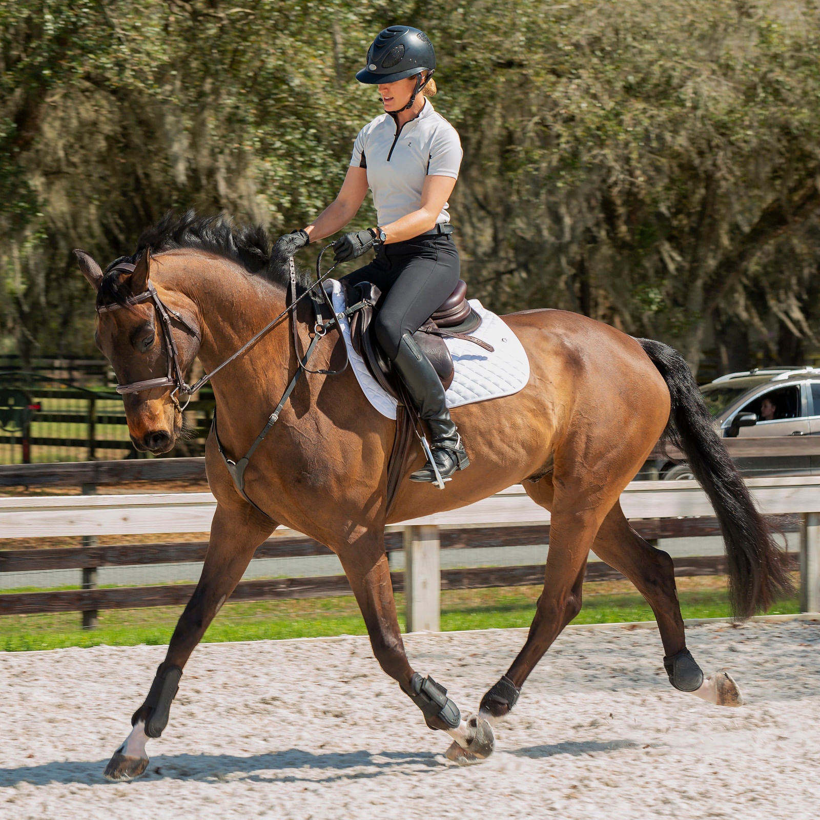 The Maud Breech is the perfect show and schooling breech with a very flattering fit designed for all day wear. The fabric is high quality technical fabric with a lot of stretch from the spandex and offers moisture-wicking and quick-drying features. Spandex content provides just enough stretch to move with you comfortably and also helps with fabric shape retention and reduces waist gap and saggy knees. The fabric is lightweight, ideal for 3 season wear, and extra comfortable on warmer days. It has two front slash pockets with room for phone and treats. It has a Euro seat with no back pockets for a stylish, classic look. The silicone grip on inner thighs is in a self subtle color for added hold when riding and the silicone grip inside the waist helps to keep shirt neatly tucked in. The extra wide 2 inch waistband provides a flattering fit and stays put comfortably all day in and out of the saddle. It features gutos hook slide closure with internal reinforcement so only fabric touches and there is no hardware to pinch the skin. Durable and stretchy micromesh sock bottoms are added for minimal boot bulk. These are a must have!