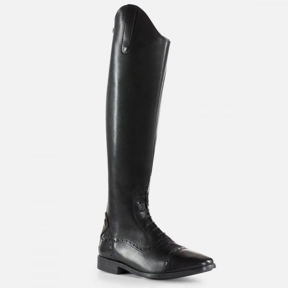 Beautiful Brazilian leather boots have a back zipper with an elastic flap for a sleek and smooth style. A rubber sole along with multiple foot and width sizes ensure comfort. The foot features punched details, fixed elastic laces, and a spur rest. Construction details include a soft suede lining for comfort and Z emblem at the top of the leg that includes a small metal button. A leather strap with snap button at the top and bottom of the zipper keeps this boot securely fastened. These gorgeous boots will look impeccable in the show ring.