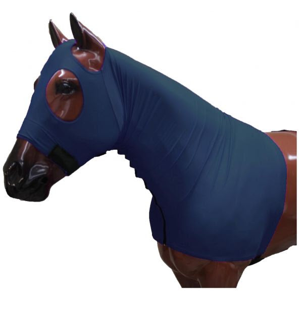 Showman Form fitting, breathable Lycra hood with zipper neck. Elastic bands around nose, jaw and back feature sure grip velcro for a secure fit and help keep marerial away from eyes and ears. Noseband is lined with fleece and elastic to prevent rub marks. Zipper extends from under the cheek to the center of the chest.