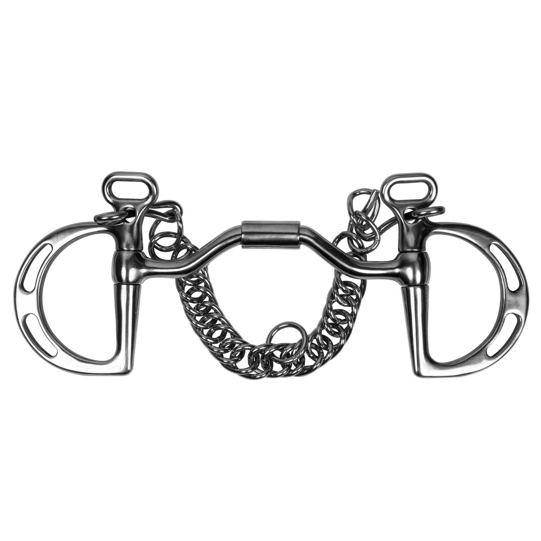 The Ported Barrel Kimberwick offers a comfort zone when the horse is relaxed and flexed at the poll. This bit functions as both a direct action and leverage bit using a curb strap or chain. If the rein is attached to the top hook, it works as a direct action bit, exerting the same amount of pressure on the mouth as on the reins. If the rein is attached to the bottom hook, it works like a leverage bit, tilting the mouthpiece forward and applying pressure to parts of the mouth, curb and poll.