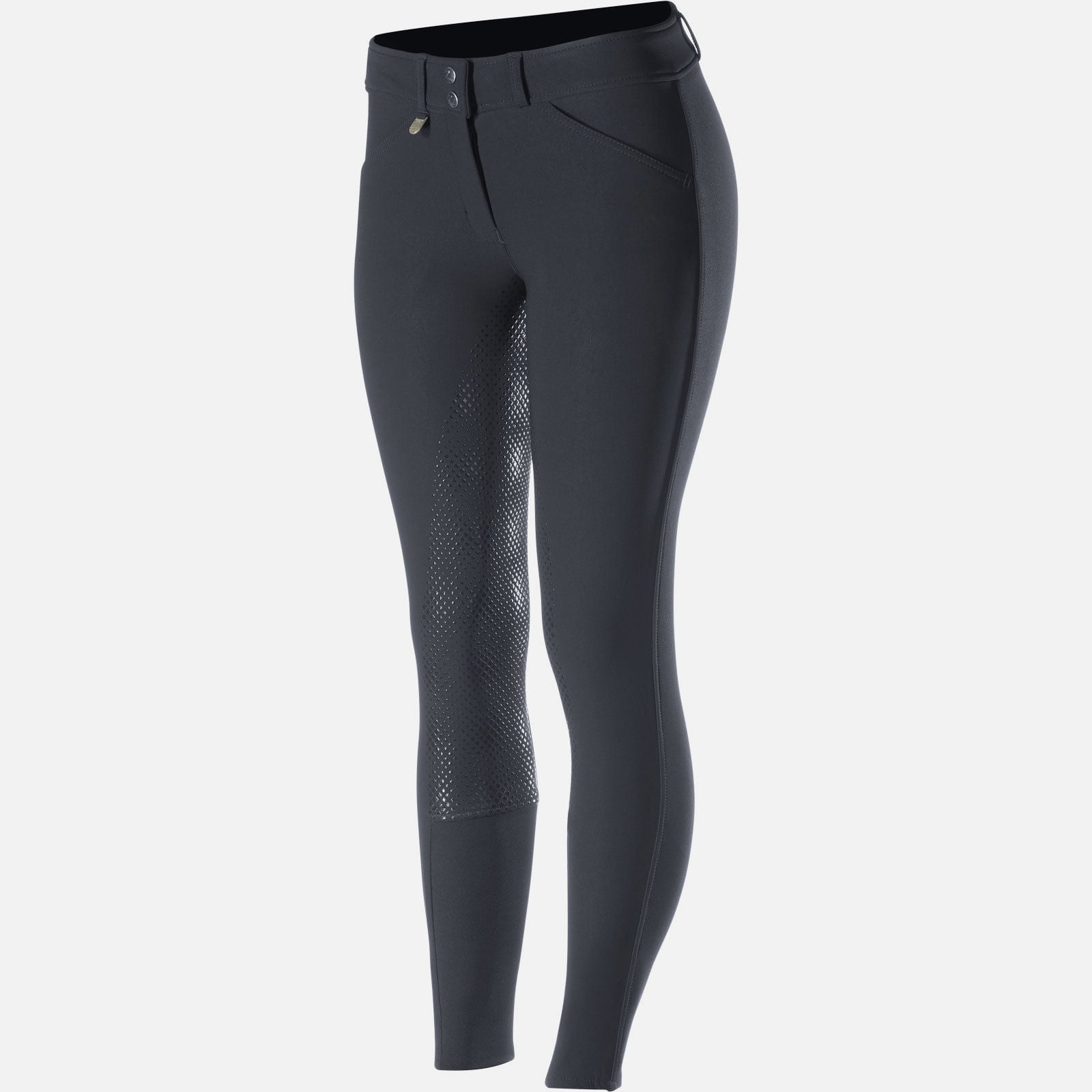 The Horze Women's Grand Prix Full Seat Breeches with Silicone Grip are great breeches whether you're riding in a clinic, weekly lesson, or a show jumper arena. These new and improved classic breeches will add a professional touch to your look. The Grand Prix style is a trusted choice of top athletes and for equestrians of all disciplines. The cut is elegant, formal, and timeless. The silicone full seat provides great grip for added security in the saddle. A comfortable, contoured medium waistband adds to the whole package and you will choose these breeches when you want to look and feel your best. The Women's Grand Prix Silicone Grip Full Seat Breeches, by Horze, are made from a new functional, breathable fabric that has a water and dirt repellent surface. Dust and grime won't stick to these ultimate show breeches. These stylish and functional riding pants include UV protected fabric (UPF 50+).