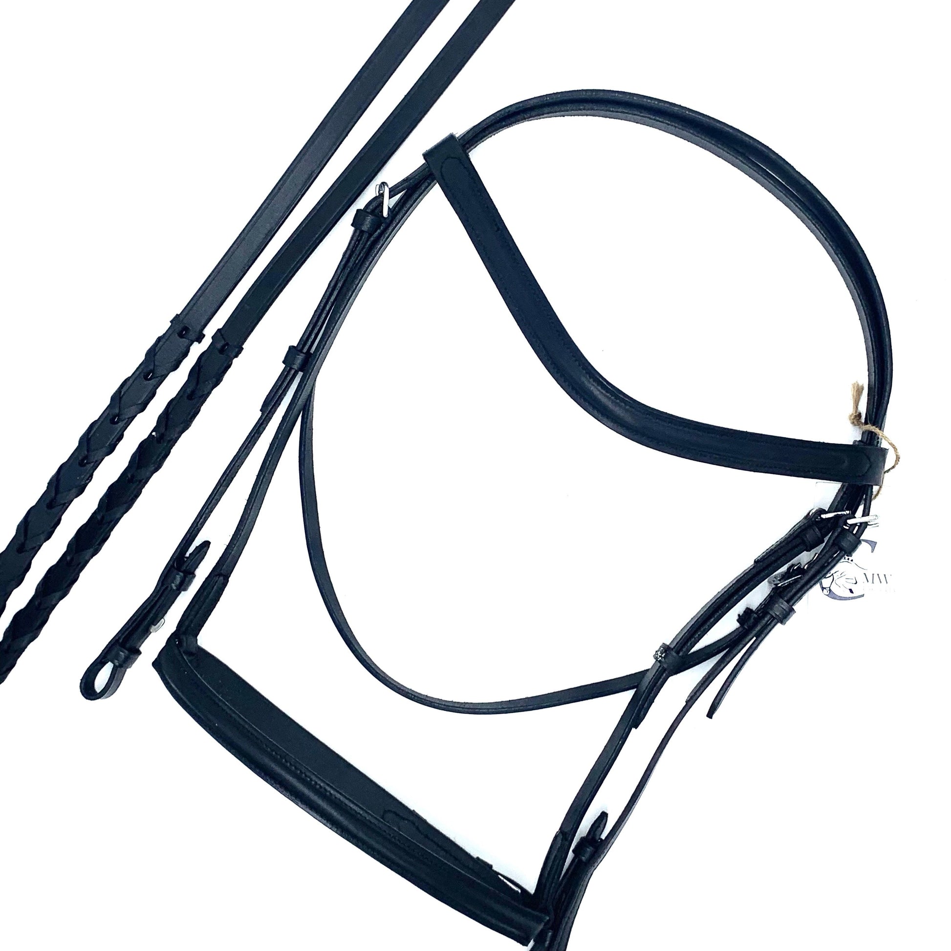 English leather bridle with plain raised browband and noseband. Double stitched leather reinforcements. Bridle comes complete with corresponding leather laced reins. Imported.
