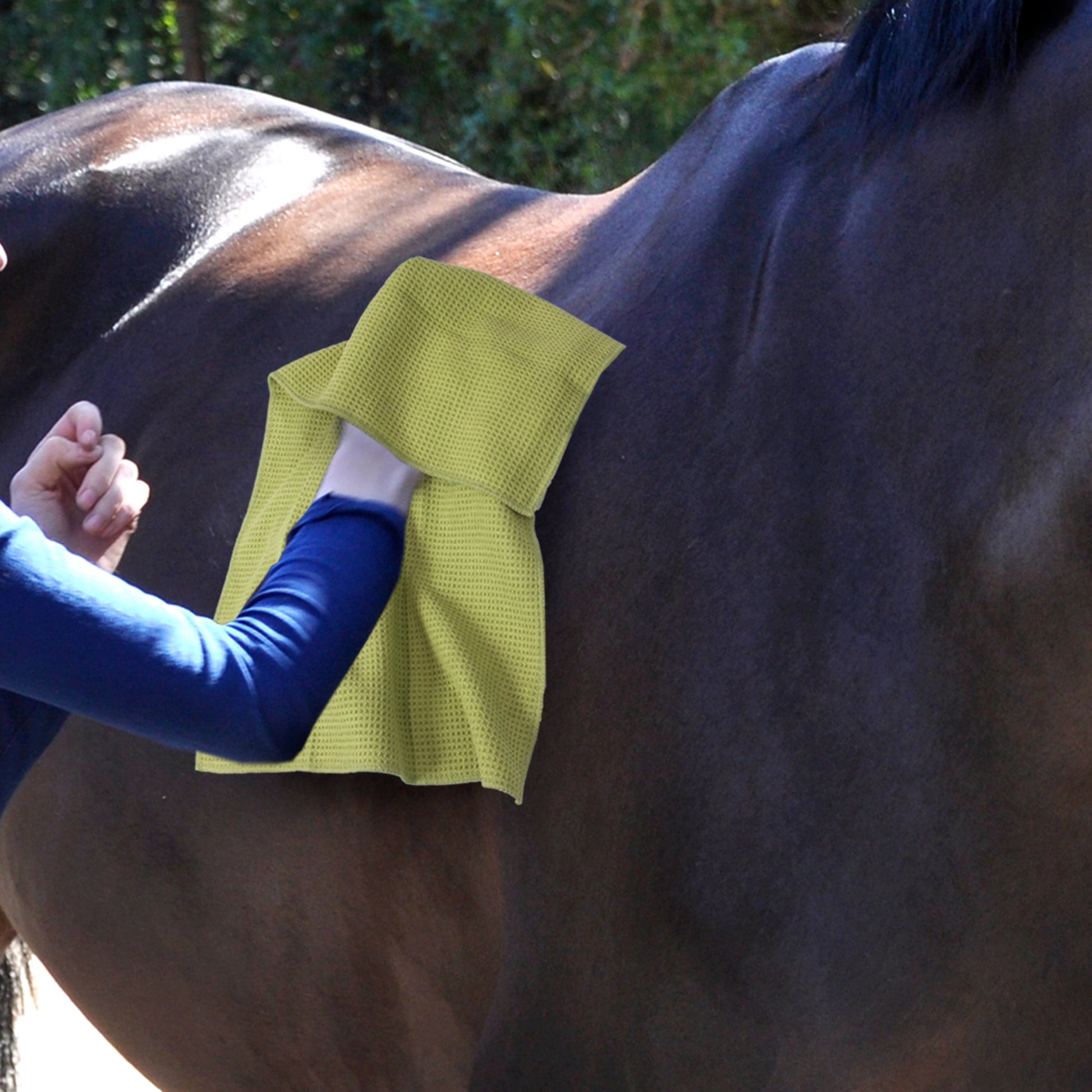 Waffle Weave Wipe Down Cloth. Great for wiping off sweat and lather from your horse. Use before and after workout for all over body grooming. Made of Micro Fiber. Machine washable, but do not use fabric softener. Available as Single or 6-Pack.