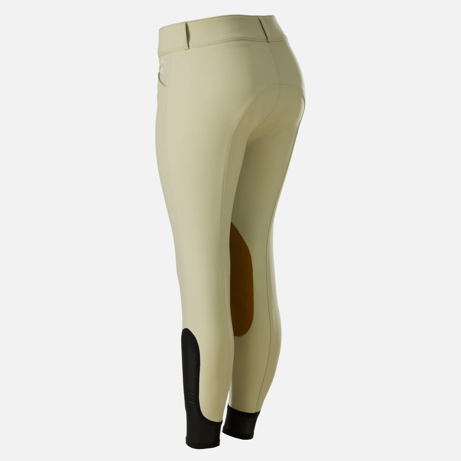 The Maud Show Breech is the perfect competition breech with a very flattering fit designed for a clean look for the show arena. The fabric is high quality technical fabric with a lot of stretch from the spandex and offers moisture-wicking and quick-drying features. Spandex content provides just enough stretch to move with you comfortably and also helps with fabric shape retention and reduces waist gap and saggy knees. The fabric is lightweight, ideal for 3 season wear, and extra comfortable on warmer days. It has two front slash pockets with room for phone and treats. It has a Euro seat with no back pockets for a stylish, classic look. It has a chestnut-colored Ultrasuede knee patch grip in a traditional show tan and the silicone grip inside the waist helps to keep shirt neatly tucked in. The extra wide 2 inch waistband provides a flattering fit and stays put comfortably all day in and out of the saddle. It features gutos hook slide closure with internal reinforcement so only fabric touches and there is no hardware to pinch the skin. Durable and stretchy micromesh sock bottoms are added for minimal boot bulk. These are a must have!