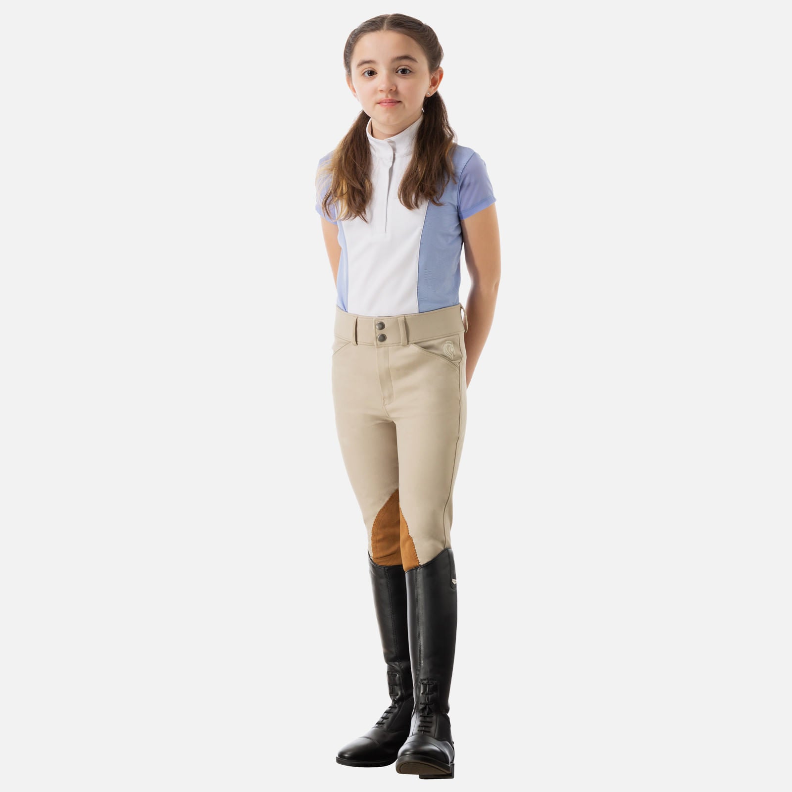 The Tuva Show Breech is just like the Maud collection for women, but in kids sizes! It is the perfect competition breech with a very flattering fit designed for a clean look for the show arena. The fabric is high quality technical fabric with a lot of stretch from the spandex and offers moisture-wicking and quick-drying features. Spandex content provides just enough stretch to move with you comfortably and also helps with fabric shape retention and reduces waist gap and saggy knees. The fabric is lightweight, ideal for 3 season wear, and extra comfortable on warmer days. It has two front slash pockets with room for phone and treats. It has a Euro seat with no back pockets for a stylish, classic look. It has a chestnut-colored Ultrasuede knee patch grip in a traditional show tan and the silicone grip inside the waist helps to keep shirt neatly tucked in. The extra wide 2 inch waistband provides a flattering fit and stays put comfortably all day in and out of the saddle. It features gutos hook slide closure with internal reinforcement so only fabric touches and there is no hardware to pinch the skin. Durable and stretchy micromesh sock bottoms are added for minimal boot bulk. These are a must have!