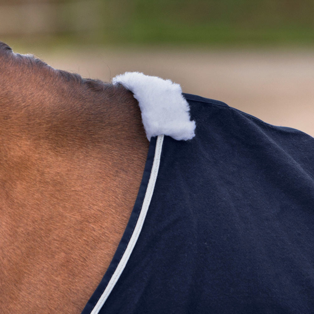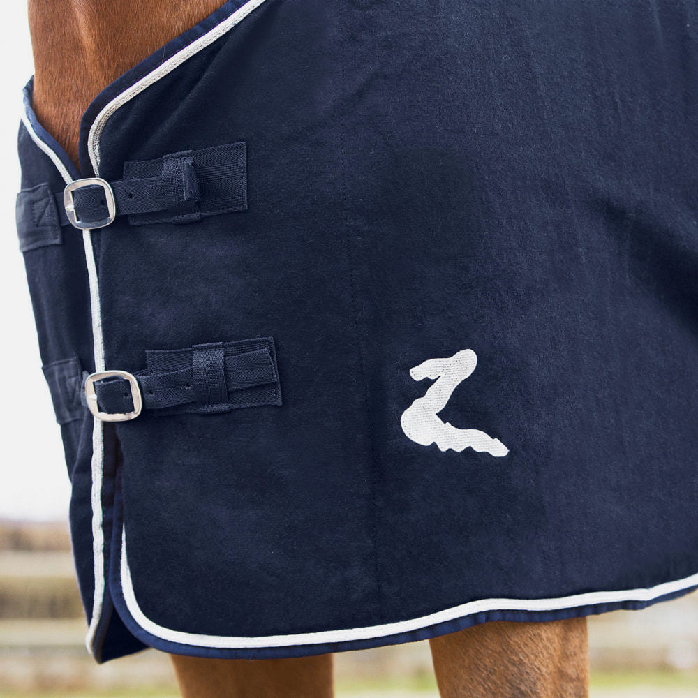 This wool blanket is styled with a heavy corded embellishment on the hip in a classic design that compliments the lovely silver piping and Z logo. A secure fit with low cross surcingles and a double buckle front closure keep this sheet in place. The Millau dress sheet will be your favorite choice for travel as your horse will arrive refreshed and handsome with a clean and shiny coat as he unloads at your next event. Breathable wool means your horse stays warm yet won't overheat. The durable construction looks delicate but is sturdy, robust, and washes well, lasting season after season.