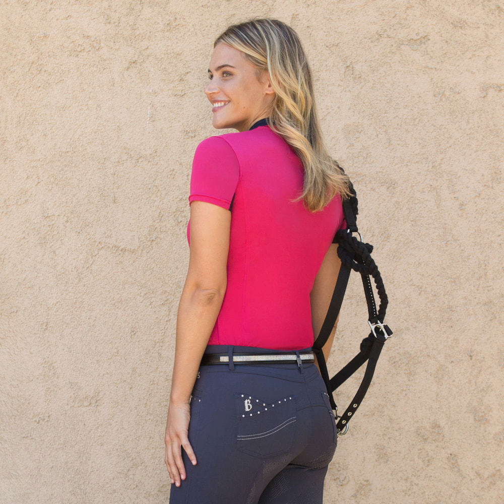 This stretchy and breathable sun shirt is both stylish and comfortable, perfect for riding or casual occasions. The quick-drying fabric offers UPF 30+ protection and works with the mesh under arms to provide an ultimate cooling effect while you ride. The 1/4 zip front allows you to wear the collar up, or down to reveal the contrasting inner lining of the collar. Choose from a variety of trendy or traditional colors and pair with breeches for a cool summer look.