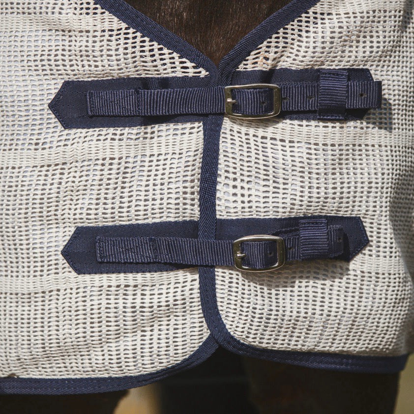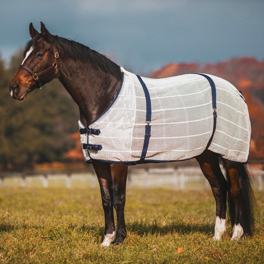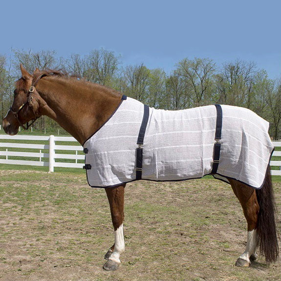 Anti-Sweat Sheet made from 100% cotton material with reinforced double front closures, two outside straight surcingles, standard neck cut and fleece padding at the withers. Machine washable. Possible shrinkage from washing may occur. IMPORT.