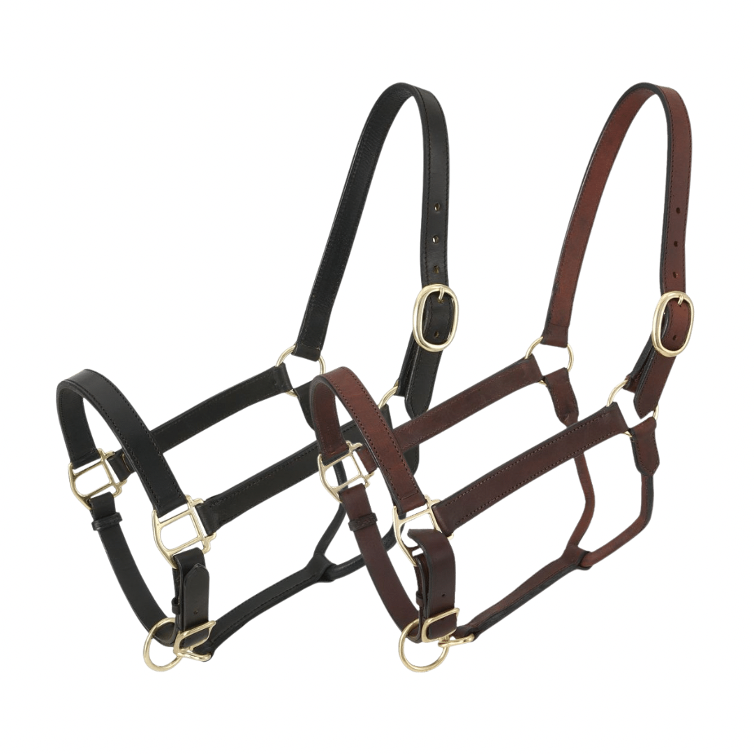 A fine imported handmade halter of full weight leather with handsomely finished edges. Solid brass trimmed with swedge buckle at head. Doubled and stitched cheeks. Adjustable at nose.